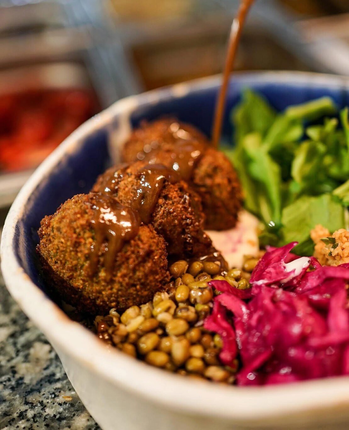 Un concentré de saveurs du Liban : houmous onctueux,, falafels dorés, salade de choux à la libanaise,l concombre oignon rouge équilibrée et pleine de caractère.